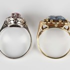 A gold ring, claw set with a rectangular cut synthetic blue spinel, detailed '585', weight 5.1g, ring size approx K, and a white gold and ruby cluster ring, claw set with the principal cushion cut ruby to the centre, detailed '750', weight 3.4g, ring size approx N.
