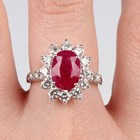 A white gold, treated ruby and diamond cluster ring, claw set with the oval cut treated ruby within a surround of twelve circular cut diamonds between diamond set three stone shoulders, detailed '18K', weight 6.2g, treated ruby weight approx 3.08ct, total diamond weight approx 1.30ct, ring size approx M1/2, with a Jewellery Report from the World Gemological Institute.