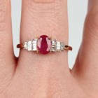 A 9ct gold, treated ruby and diamond ring, claw set with the oval cut treated ruby between baguette cut diamond three tiered shoulders, weight 2.1g, ring size approx P1/2.