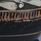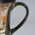 A Greek Apulian black glazed red figure kantharos, 4th century BC, the twin-handled body decorated with opposing reserve panels of leaves, height 12cm (faults and repairs). Provenance: Barnard & Moore, Arundel. Note: from the estate of a West Sussex collector.