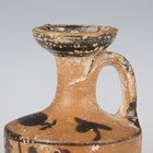A Greek red figure lekythos, 6th century BC, the ovoid body decorated with three figures, the shoulder with a cockerel, height 12.5cm (repairs). Provenance: Helios Gallery Antiquities (see certificate). Note: from the estate of a West Sussex collector.