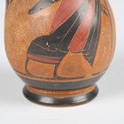 A Greek black glazed red figure lekythos type jug, 5th century BC, the bulbous body finely decorated with two figures, height 10cm. Note: from the estate of a West Sussex collector.