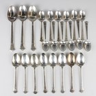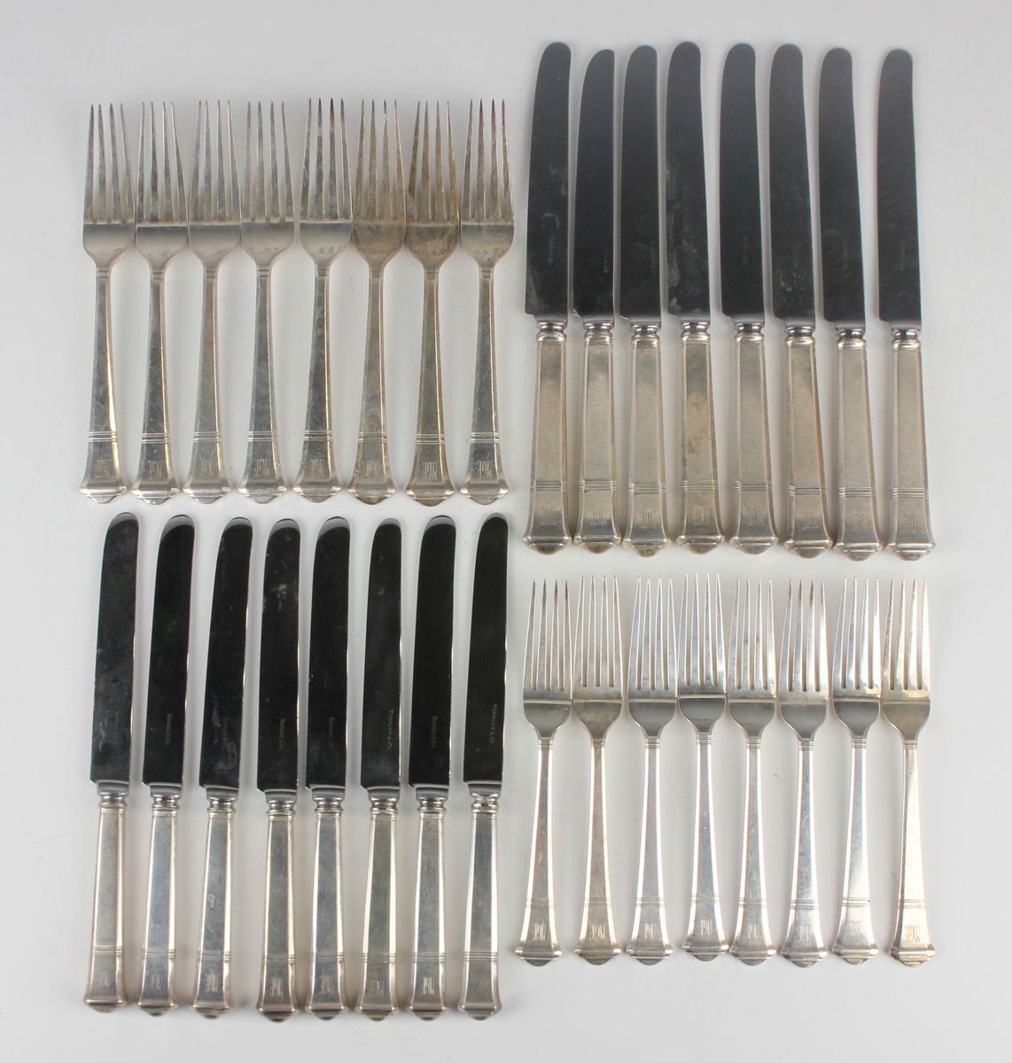 A Tiffany & Co Art Deco canteen of sterling Windham pattern cutlery, each piece engraved with initials, comprising eight steel bladed table and dessert knives, eight table and dessert forks, three tablespoons, eight dessert spoons, eight pastry forks, twelve teaspoons, eight butter knives, cheese knife, steel bladed cake slice, serving fork, two pairs of steel bladed carving knives and forks and steel, total weight excluding knives and servers 3128g.