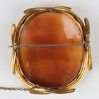 A Victorian gold mounted oval shell cameo brooch, circa 1870, carved as a female bacchante, unmarked, weight 17.8g, width 5.1cm, with a case.