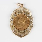 A Victoria Old Head sovereign 1899M in a 9ct gold pendant mount in a scrolling openwork design, weight 14.5g, length 5.3cm.