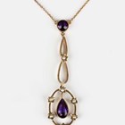 An Edwardian gold, amethyst and seed pearl pendant necklace, the front with a pear shaped amethyst to the drop within an openwork surround, mounted with seed pearls, on a circular link neckchain, detailed '9ct', with a boltring clasp, detailed '9ct', weight 3.3g, length 42.5cm.