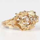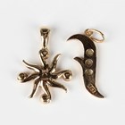 A 9ct gold and diamond three stone ring in an abstract design, claw set with circular cut diamonds, London 1977, ring size approx M1/2, a 9ct gold and diamond pendant in a sunburst design, mounted with five circular cut diamonds, and a gold pendant, mounted with three diamonds, detailed '9ct', total weight 6.7g.