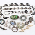 Six pieces of niello silver jewellery, comprising a necklace, two bracelets, a pendant with chain, a ring and a single pendant earring, total weight 50g, together with fifteen brooches.