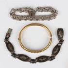 A Victorian gold oval hinged bangle, the front with applied bead and wirework decoration, on a snap clasp, unmarked, weight 16.8g, inside width 5.6cm (hinge broken), a silver multiple link bracelet on a silver heart shaped padlock clasp, and a Siamese sterling silver niello bracelet.
