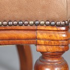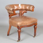 A Victorian mahogany library armchair, upholstered in brown leather, the curved back and shaped seat above fluted tapering legs, height 75cm, width 70cm, depth 62cm.