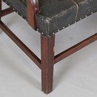 An early 20th century George III style mahogany triple-shield back settee, upholstered in buttoned brown leather, height 99cm, width 158cm, depth 64cm.