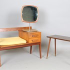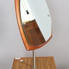 A mid-20th century teak telephone table of retro design, height 63cm, width 91cm, depth 42cm, together with a similar table, width 35cm, and a table mirror, height 52cm.