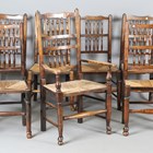 A harlequin set of six late 19th/early 20th century turned ash spindle back chairs with rush seats, height 97cm, width 48cm, together with a similar carver chair, height 111cm, width 63cm.