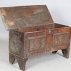 An 18th century and later oak coffer, the hinged lid above a double panel carved front, height 52cm, width 93cm, depth 38cm (alterations).