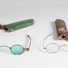 A George III shagreen and white metal mounted spectacles case, length 13cm, containing a pair of spectacles, together with a pair of 19th century blue tinted spectacles and a worn leather case.