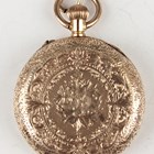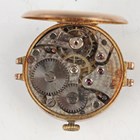 A gold cased keyless wind open-faced lady's fob watch with unsigned gilt jewelled cylinder movement, gilt metal inner case, the foliate engraved gilt dial with black Roman numerals, the case back interior detailed '14K', case diameter 3.3cm, total weight 26.8g, together with a 9ct gold cased lady's wristwatch, import mark Glasgow 1924, case diameter 2.4cm, total weight 13.7g.