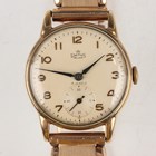 A Smiths Deluxe 9ct gold circular cased gentleman's wristwatch, the gilt jewelled lever movement detailed '15 jewels C384195 Made in England', the signed dial with gilt Arabic numerals, subsidiary seconds and blued steel hands, the Dennison case interior numbered '819374', the case back presentation inscribed, Birmingham 1957, case diameter 3.1cm, on a gilt metal fronted expanding metal bracelet, with original Smiths Deluxe case.