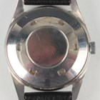 A Longines Silver Arrow stainless steel circular cased gentleman's wristwatch, circa 1957, the signed jewelled 23 ZSD caliber movement numbered '10509139', the signed dial with gilt hour markers and date aperture, the signed case back interior detailed '9104-5' above '332', case diameter 3.3cm, on a black leather strap.