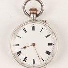 A group of four silver cased keyless wind open-faced ladies' fob watches, each with enamelled dial and black Roman hour numerals, case diameters ranging from 3.5cm to 3.9cm, together with a .800 silver cased keywind open-faced lady's fob watch, the enamelled dial with black Roman hour numerals and detailed 'Law Bros London & Locle', case diameter 3.8cm, and three other silver cased ladies' fob watches, diameters ranging from 3.5cm to 4.1cm.