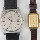 An Omega steel cased gentleman's wristwatch, circa 1972, with signed jewelled 613 caliber movement, the signed silvered dial with baton hour markers and date aperture, the signed case back interior numbered '1360049', case width 3.5cm (lacking winding button), together with an Omega Deville gilt metal fronted and steel backed lady's wristwatch on a leather strap with Omega buckle, case width 1.7cm.