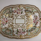 A Ridgway ice pail and cover, circa 1815-20, pattern No. 660, the U-shaped body painted with pink roses within rococo scroll frames against a pale celadon ground between gilt borders, raised on three gilt dolphin feet and a triform base, height 28cm, together with six other pieces with similar decoration, including a pair of square dishes with moulded fruiting vine handles, length 23.5cm. Provenance: from the collection of the late Graham and Rhiannon Berridge.