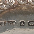An Elizabeth II silver three-piece condiment set of tapering cylindrical form, comprising mustard, pepper caster and salt, Birmingham 1960, cased, a silver oval bonbon dish with pierced and embossed rim, Birmingham 1912, length 14.5cm, another similar silver bonbon dish and a matched pair of silver bonbon dishes, total weight 261.7g, together with a plated serving knife and fork, cased.