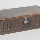 A Charles II oak box, the hinged lid above a carved front, height 16cm, width 60cm, depth 29cm.