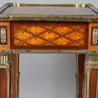 A near pair of early 20th century Louis XVI style mahogany and satinwood two-tier side tables by Edwards & Roberts, applied with overall gilt metal mounts and inlaid with lattice panels, height 69cm, width 41cm, depth 35.5cm.