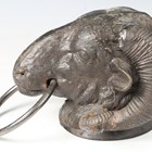 A late 20th century cast iron ram's head wall mask with ring handle, height 14cm.