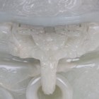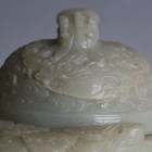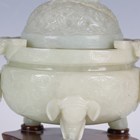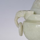 A Chinese pale celadon jade jar and cover, 20th century, the domed cover carved in low relief with a dragon emerging through vapours rising to a head finial, the squat circular body decorated with lotus and scrolling tendrils, flanked by a pair of carved and pierced archaistic mask and loose ring handles, raised on three elephant mask feet, height 14.8cm, width across handles 18.2cm, with hardwood stand.