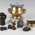 A small group of South-east Asian metalwork, comprising a Chinese small bronze meiping, height 8.4cm, a bronze figure of a recumbent stag, height 5.9cm, an archaistic bronze figure of a bear with verdigris patination, height 6cm, a Japanese bronze okimono netsuke of two carp, length 4.7cm, a Japanese bronze okimono netsuke in the form of a child seated on Daikoku's mallet, signed, length 4cm, and two Chinese polished brass censers.