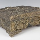 A Japanese antimony rectangular jewellery box, early 20th century, decorated in relief with dense chrysanthemums, the hinged lid revealing a compartmentalized camphor-lined interior, length 31.5cm.