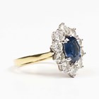 An 18ct gold, sapphire and diamond cluster ring, claw set with oval cut sapphire within a surround of ten circular cut diamonds, weight 5.8g, sapphire weight approx 1.80ct, total diamond weight approx 1.50ct, ring size approx N, with a case.