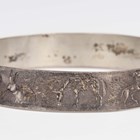 A silver circular expanding bracelet, decorated with farmyard animals, London 1991, inside width 5.9cm, a Georg Jensen silver acorn pattern pusher, detailed 'Georg Jensen Sterling Denmark', total weight 33.6g, a gilt metal fob watch key and a pendant, designed as a flowerbud.