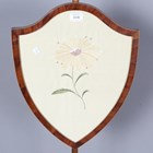 A George III mahogany polescreen, the shield shaped screen with later embroidered panel, height 151cm, width 36cm.
