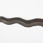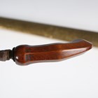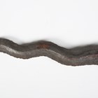 An Indonesian kris dagger with wavy double-edged blade, blade length 34cm, detailed with sinuous bird-beak decoration, and carved wood grip, with brass-mounted wood scabbard, embossed with scroll decoration to one side.