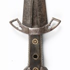 A 16th century Italian cinquedea dagger with double-edged triangular-section fullered blade, blade length 19cm, downswept openwork quillion, part-steel and part-horn inset grip with ribbed decoration and gold inset gothic decorated roundels, and shaped and engraved bonnet-form pommel.