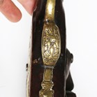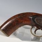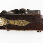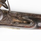 An early 19th century sea service pattern percussion pistol, barrel length 15.5cm, the lock marked 'Tower', with swing-over ramrod, full-stocked with brass furniture (lacking hammer), together with a George III period flintlock pistol, barrel length 22cm, with ornate cast brass furniture.