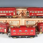 A Lionel gauge O 3-rail No. 251E electric locomotive with pantographs and roof lights (restoration), together with three Pullman coaches, one with veranda, coaches boxed (scratch marks, playwear and rust spots, boxes damaged).