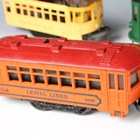 A Lionel gauge O electric 3-rail plastic-bodied No. 60 trolley bus, boxed, three similar trolley buses, a Bowser tinplate trolley bus and another (some playwear, box creased, torn and repaired).