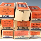 A collection of Lionel gauge O 3-rail goods rolling stock, including No. 3444 animated gondola car, No. 55 Tie-Jector car and No. 3360 operating Burro crane, all boxed (some playwear, boxes creased, torn, scuffed and repaired).
