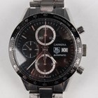 A Tag Heuer Carrera Automatic stainless steel gentleman's chronograph bracelet wristwatch, Ref. CV2010-1, with signed jewelled 16 caliber movement, the signed black dial with silvered baton hour markers, three subsidiary dials, date aperture and outer tachymeter scale, the signed case back detailed 'CV2010-1' and 'RRL7338', the tapered link bracelet with foldover clasp, case diameter 4.1cm, cased.