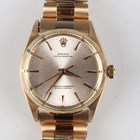 A Rolex Oyster Perpetual 9ct gold gentleman's bracelet wristwatch, Ref. 1003, the signed jewelled 1560 caliber movement detailed 'D83244', the signed silvered dial with gilt Rolex crown at 12 o'clock and baton hour markers, the signed case back interior detailed '1003', the tapered link bracelet with signed foldover clasp, import mark Glasgow 1961, case width 3.3cm, with Bureaux Suisses Chronometres certificate.