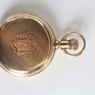 An American 14ct gold keyless wind hunting cased gentleman's pocket watch, the gilt three-quarter plate movement detailed 'E. Howard & Co Boston' and numbered '206515', the similarly signed enamelled dial with black Roman hour numerals, outer Arabic minutes and subsidiary seconds, the gold inner case with photographic print portrait of a lady, the case back interior detailed '14K Dueber 1051938', the engine turned outer case with engraved crest to front, total weight 132.5g, case diameter 5.2cm.