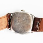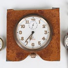 An Omega travelling timepiece, the unsigned eight day movement numbered '3369264', the enamelled dial with luminous Arabic hour numerals and subsidiary seconds at 12 o'clock and detailed 'Omega 8 Jours', case diameter 8.1cm (formerly with leather travelling case), together with a silver square cushion cased gentleman's wristwatch with unsigned jewelled movement, the enamelled dial with luminous Arabic hour numerals and subsidiary seconds, import mark London 1930, case width 2.9cm, on a brown leather strap, and a smaller base metal cased timepiece, case diameter 3.5cm.