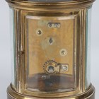 An early 20th century brass circular carriage timepiece with eight day movement, the backplate stamped 'ACG', the enamelled dial with black Roman hour numerals, the cylindrical case with swing handle above curved bevelled glass panels, on a plinth base, height 15.2cm.