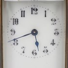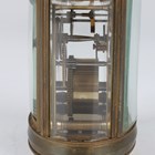 A 20th century brass oval carriage timepiece with eight day movement, the enamelled dial with black Arabic hour numerals, the oval case with swing handle above curved bevelled glass panels, on turned feet, height 15.2cm.