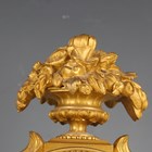 A late 19th century French ormolu mantel clock with eight day movement striking on a bell, the circular white enamelled dial with Roman hour numerals, the rococo scroll moulded case with flower and fruit charged urn finial above a pair of seated harvester putti, flanking an inset porcelain panel, on a foliate scroll and scalloped base, height 40cm (lacking pendulum).