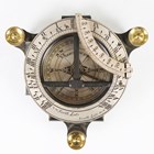 An early 20th century anodized and lacquered brass pocket compass sundial by Hamilton & Co of Calcutta, with signed silvered compass rose dial, hinged hour ring and folding gnomon, three levelling screws and two bubble levels, diameter 6.2cm, within fitted mahogany case.