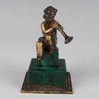 A pair of 20th century Italian silver gilt and malachite figures of seated putti playing musical instruments, each on a stepped square malachite base, height 8.8cm.